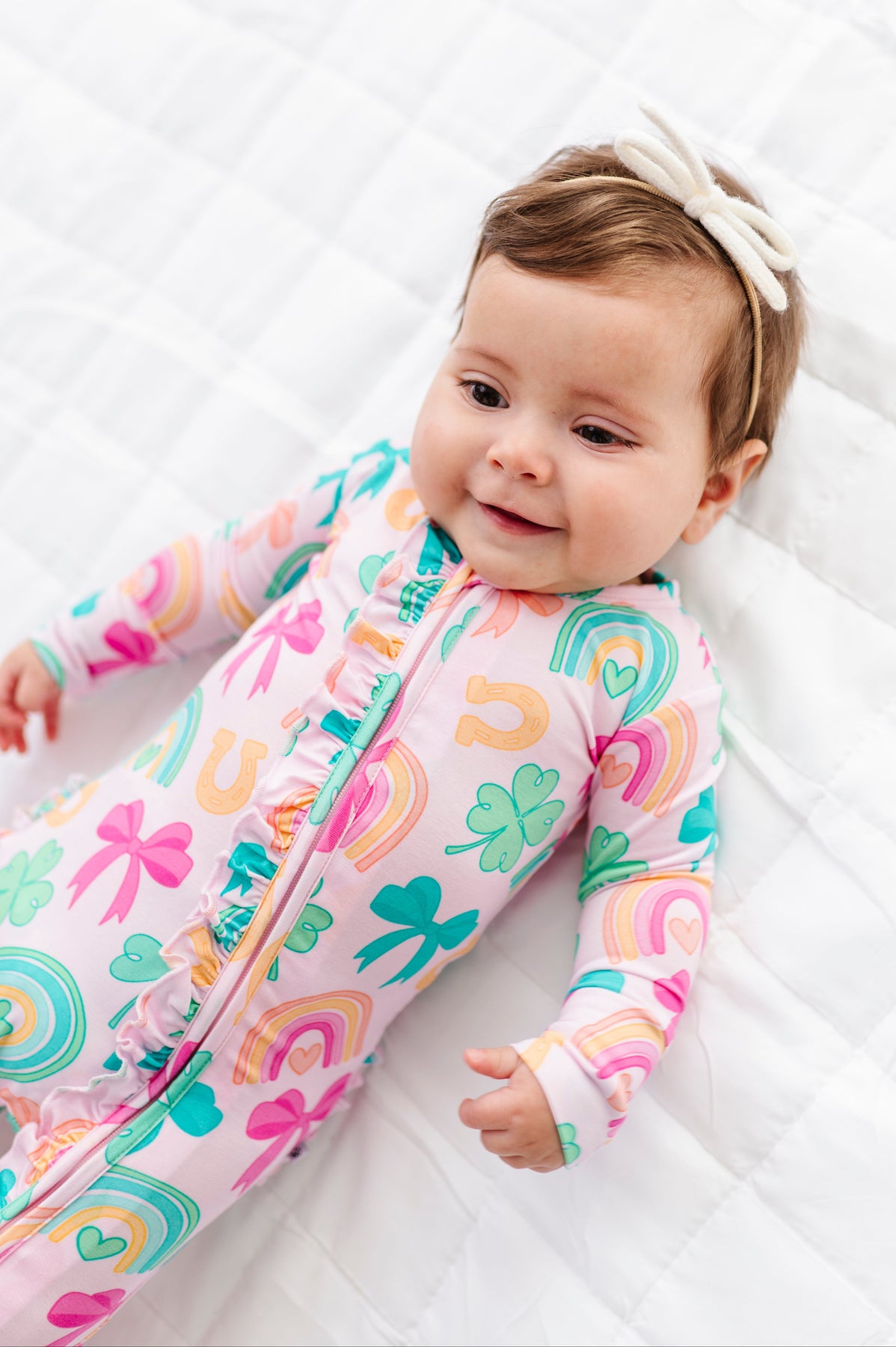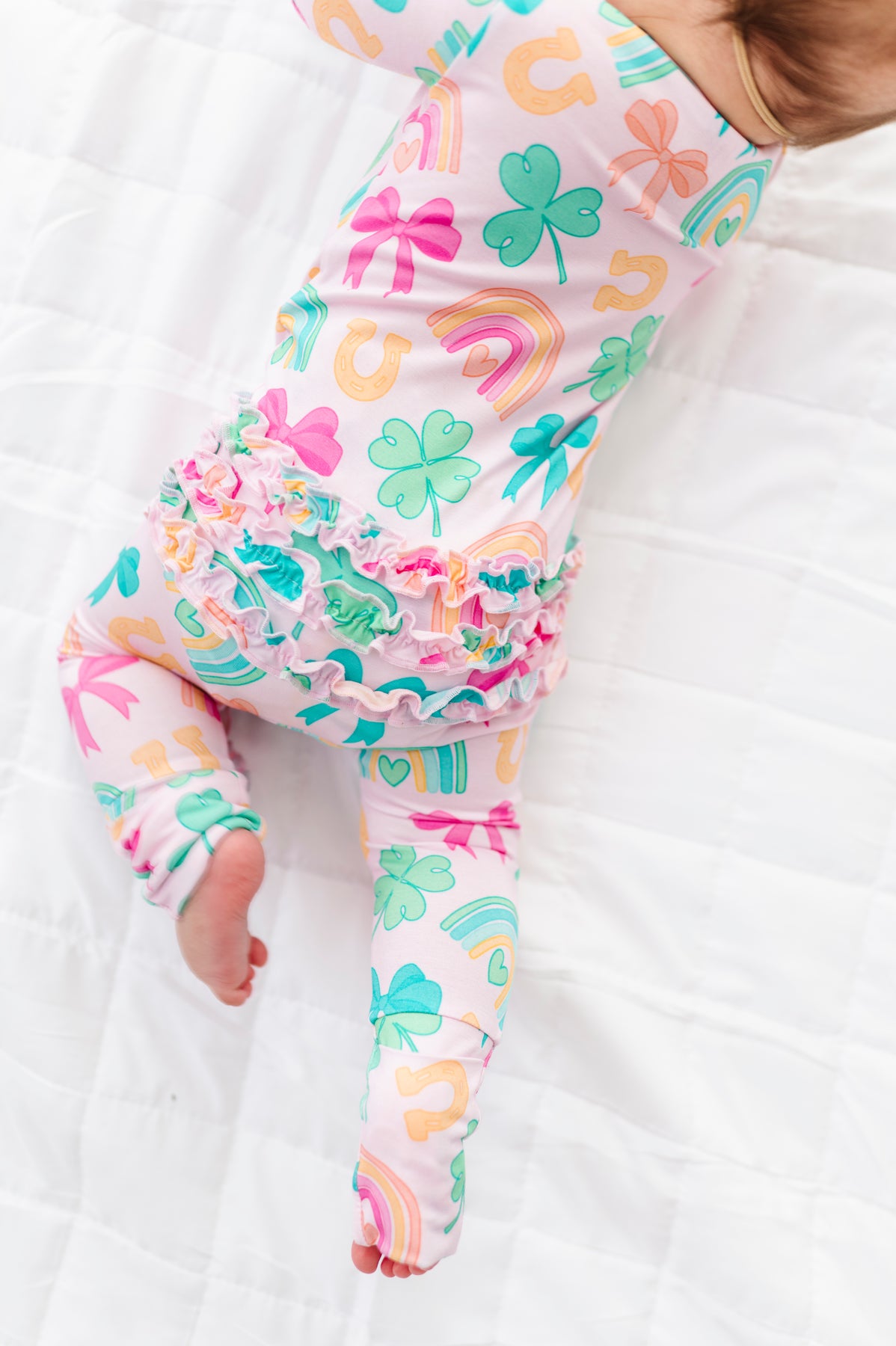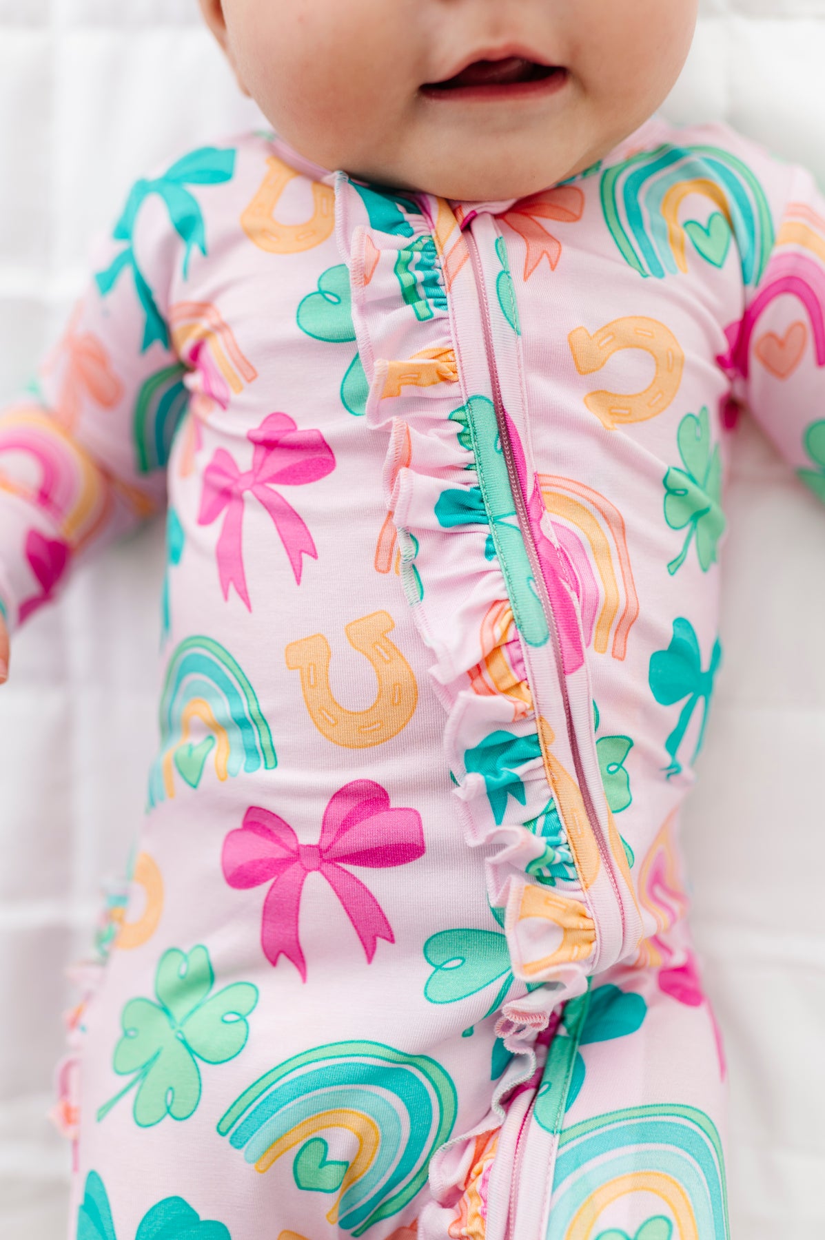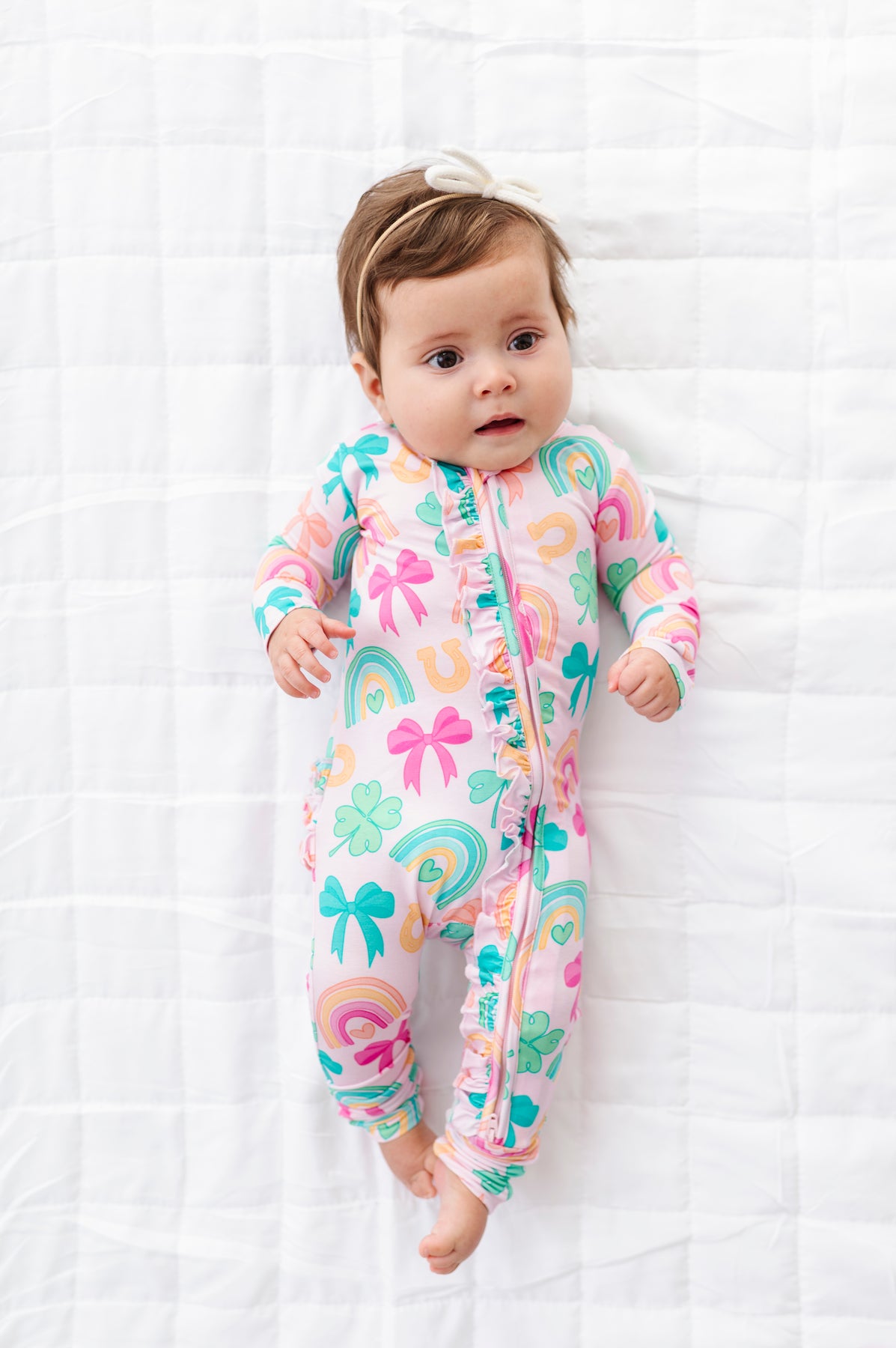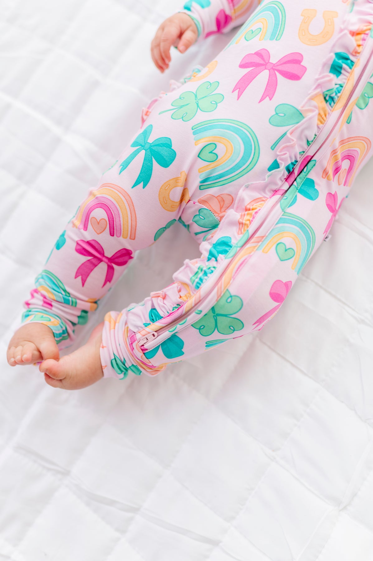 Detail shot of the Lucky Charm bamboo ruffle convertible romper featuring bows, rainbows, hearts, and four leaf clovers