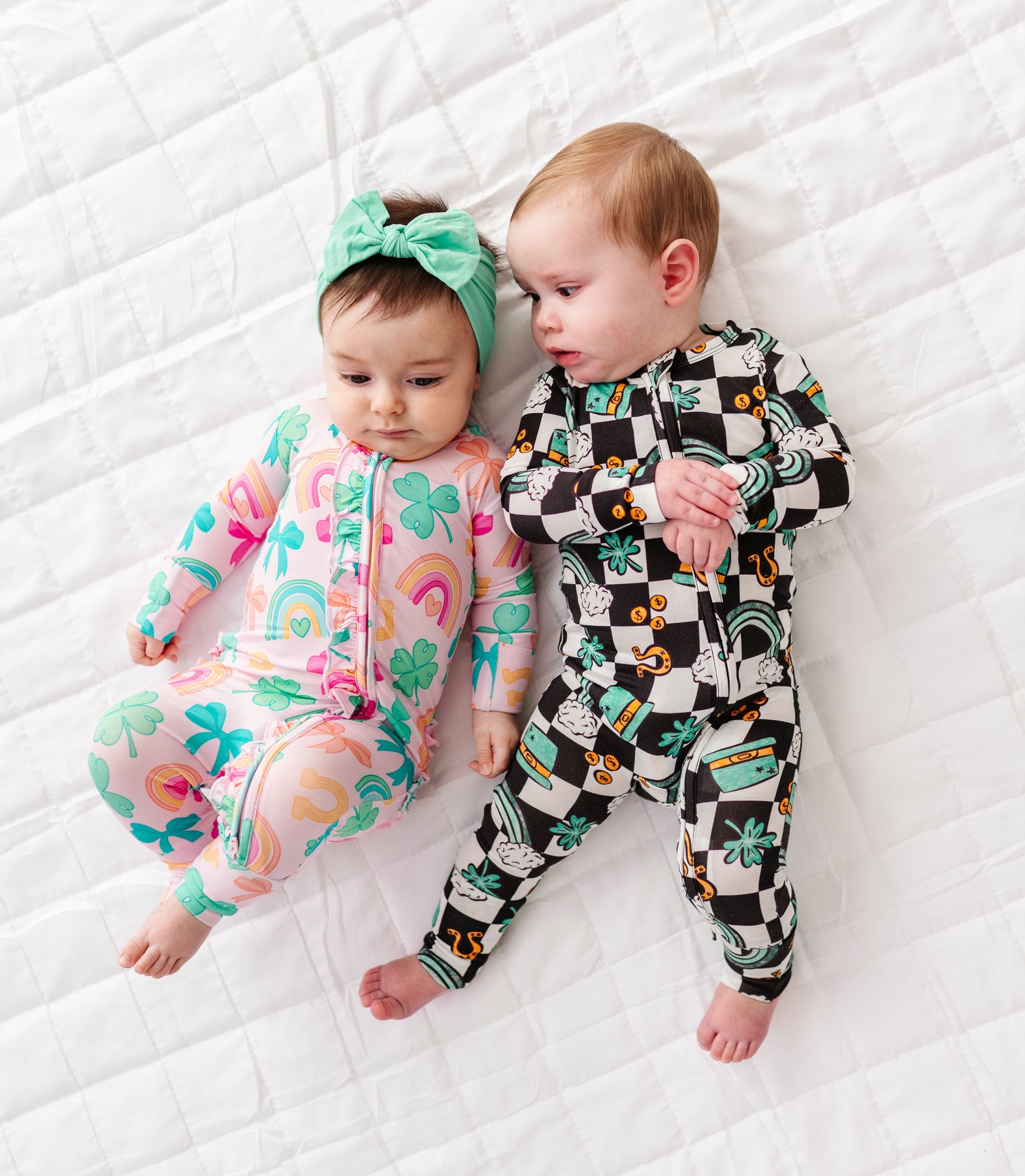 Baby girl in a color lucky charm bamboo onesie lying on a white quilted blanket