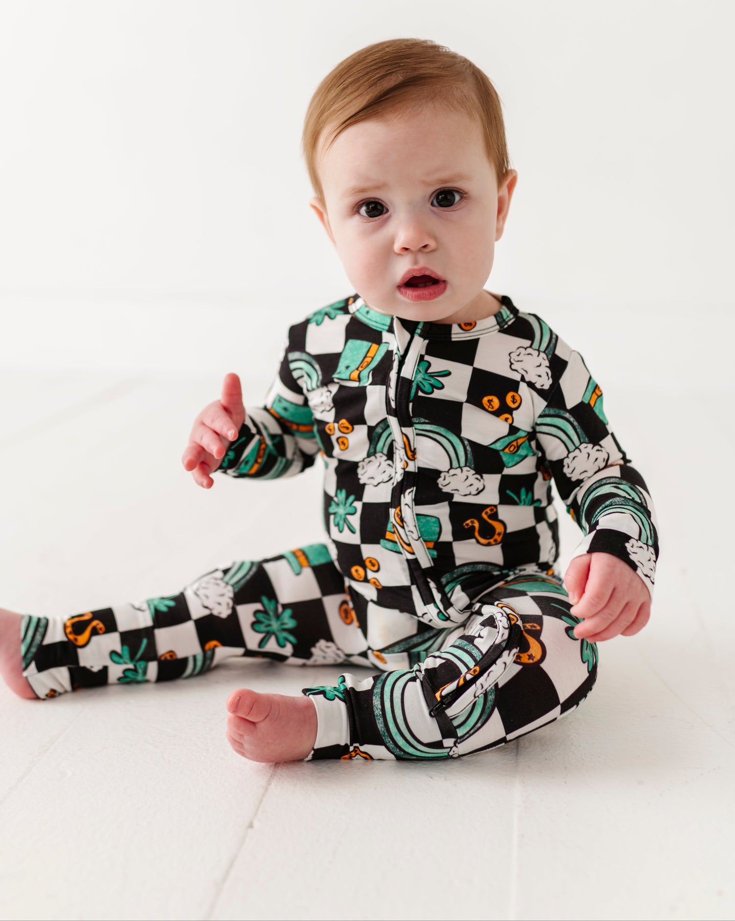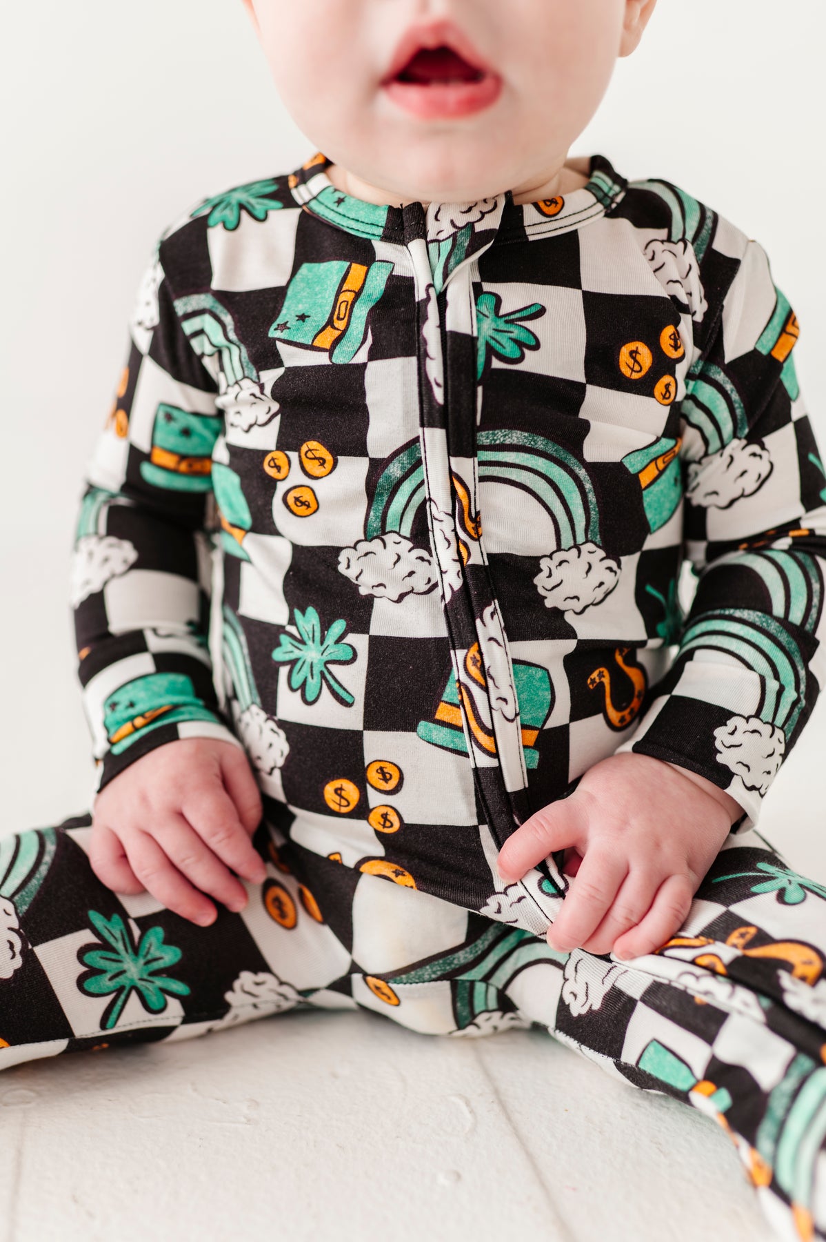 Infant wearing a checkered bamboo zip romper with St. Patrick&
