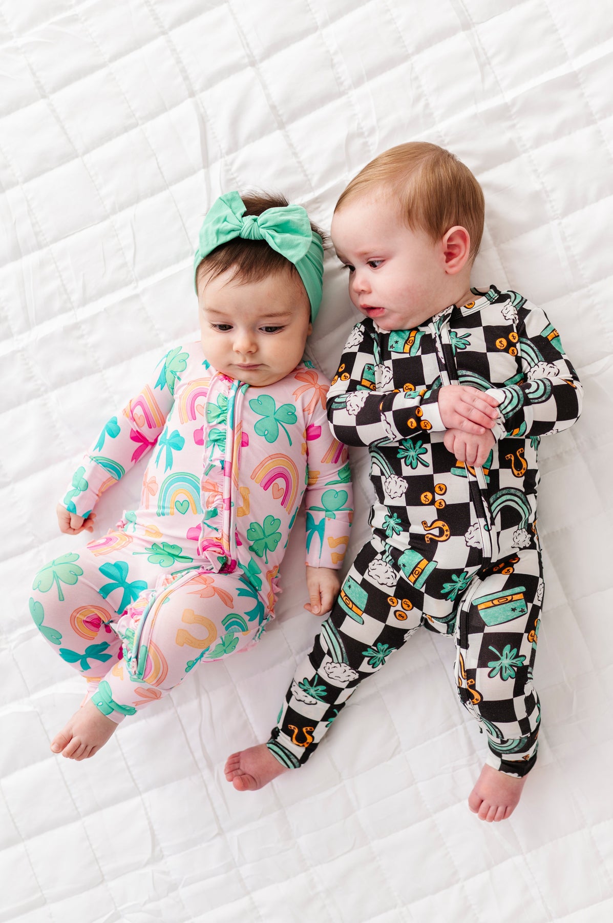 Two babies wearing colorful St. Patrick&