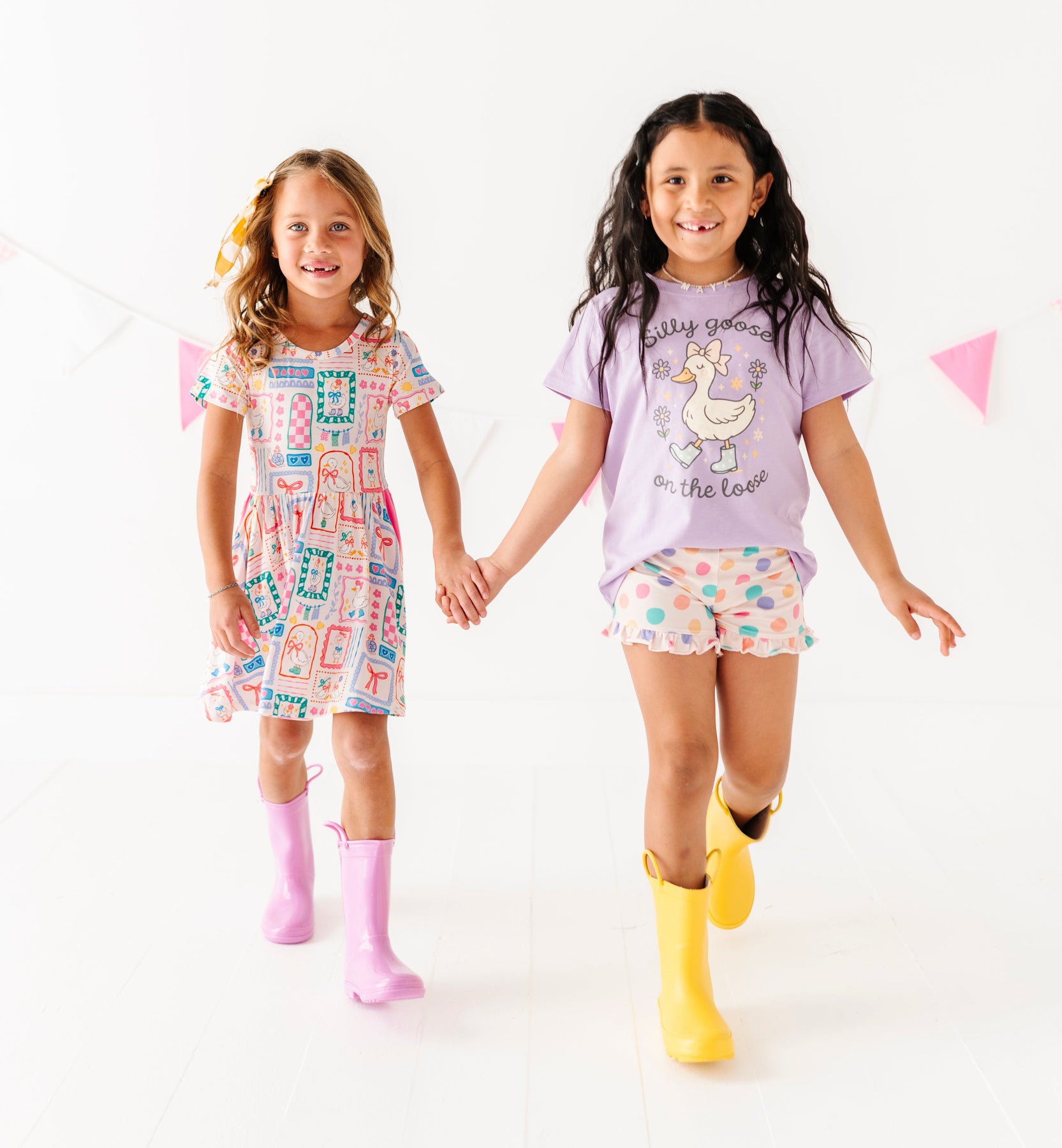 Two young girls wearing colorful outfits with rain boots on a white background