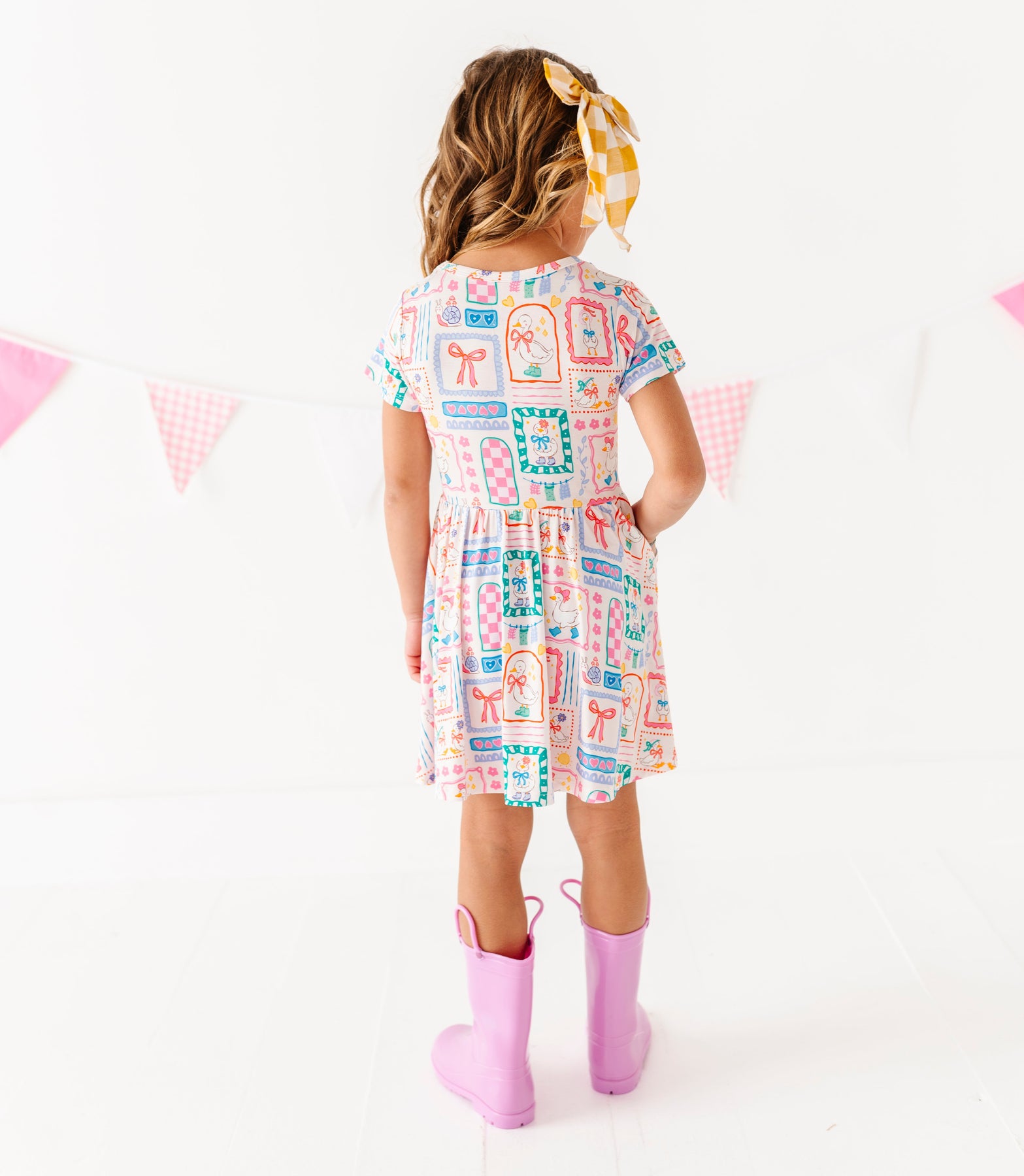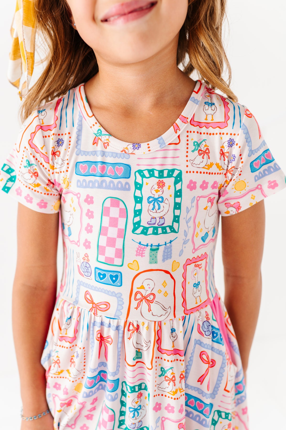 Adorned with playful pastel geese, cheerful bows, and pops of color, this short-sleeve style is the perfect mix of sweet and silly. Finished with a twirl-worthy skirt and soft, breathable bamboo fabric for all-day comfort. Because every little goose deserves to strut in style.