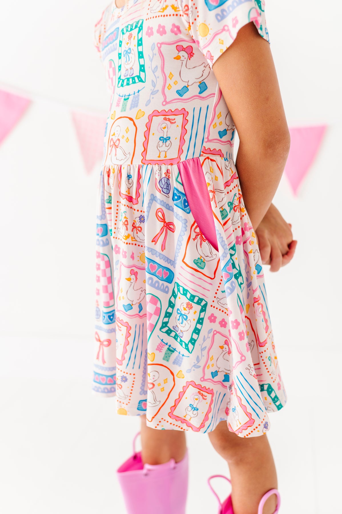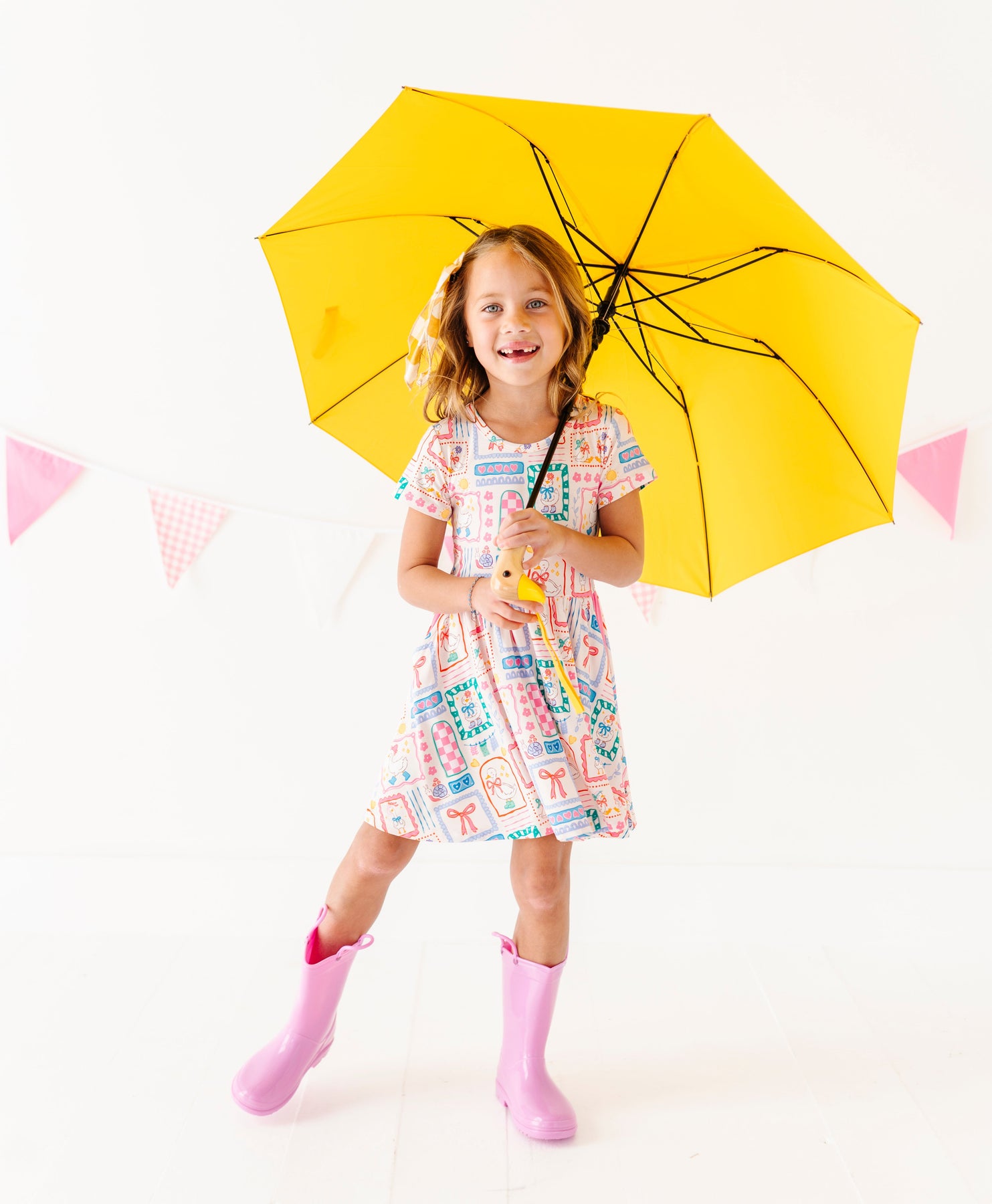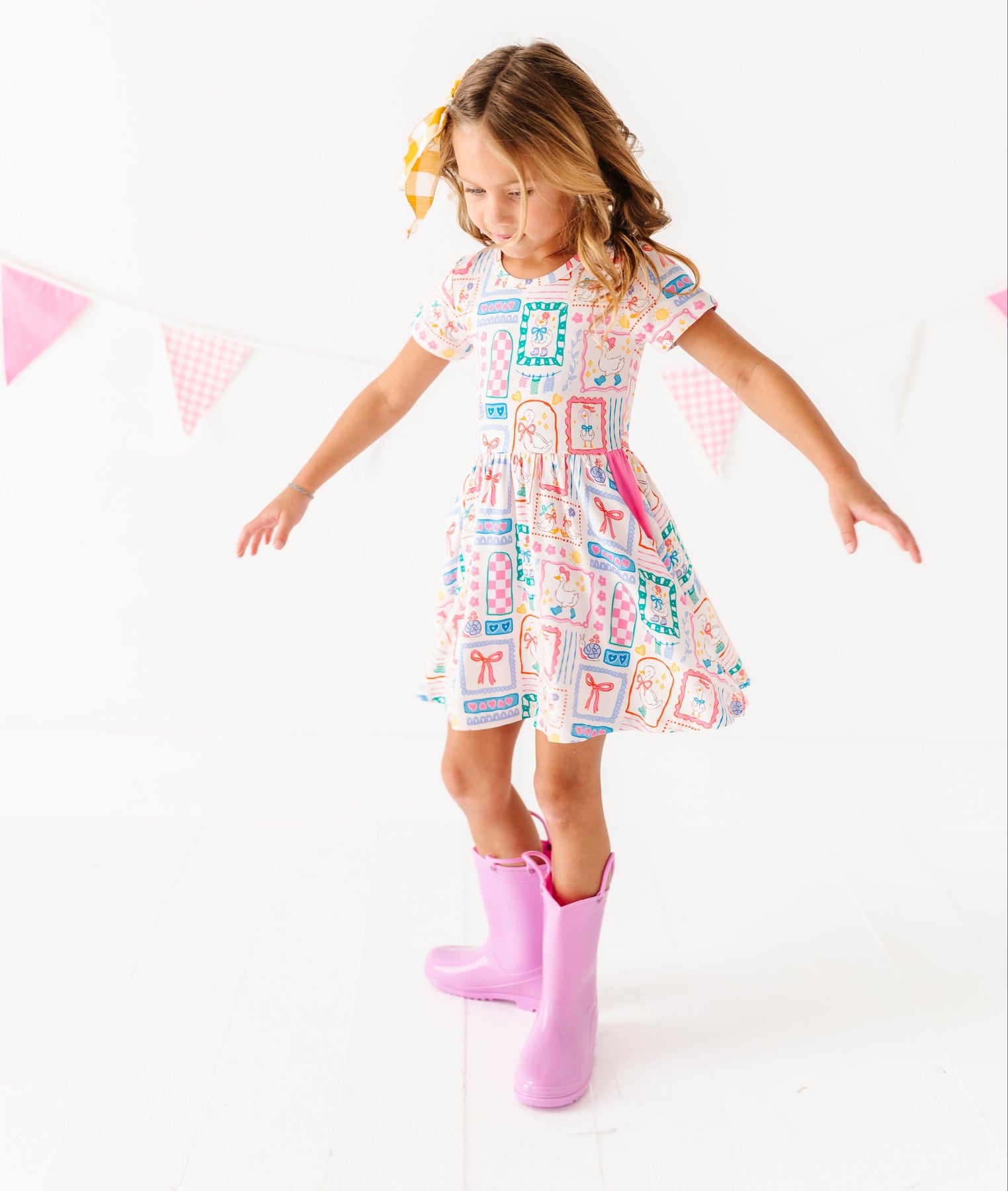 Young girl in a patterned dress and pink rain boots standing on a white background with small flags.
