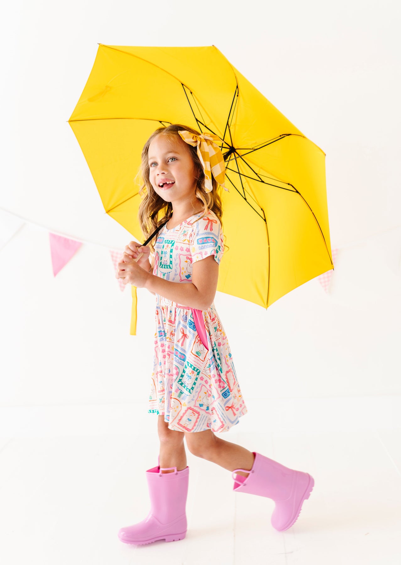 Child holding a yellow umbrella on a white background wearing a dress and rain boots